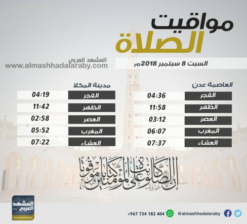 المشهد العربي ينشر مواقيت الصلاة في مدينتي عدن والمكلا وضواحيهما ليوم غدا السبت 8 سبتمبر