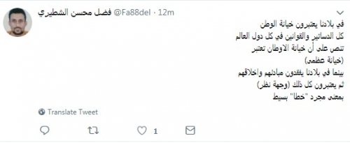 وأوضح "الشطيري"، فى تغريدة له على موقع التغريدات القصيرة "تويتر"، قائلا: " في بلادنا يعتبرون خيانة الوطن.. كل الدساتير والقوانين في كل دول العالم.. تنص على أن خيانة الاوطان تعتبر(خيانة عظمى)..بينما في بلادنا يفقدون مبادئهم واخلاقهم..ثم يعتبرون كل ذلك (وجهة نظر).. بمعنى مجرد "خطا" بسيط".