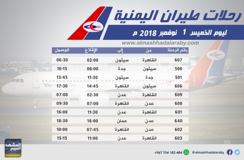المشهد العربي ينشر مواعيد رحلات طيران اليمينة ليوم غد الخميس 1 نوفمبر 2018م.. انفوجرافيك - خاص بالمشهد العربي