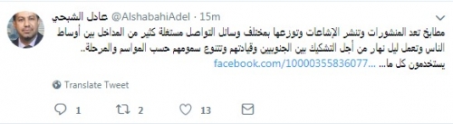 كشف الكاتب السياسي "عادل الشبحي"، فى تغريدة له على موقع التغريدات القصيرة "تويتر"، عن وجود لجان إعلامية تعمل ليل نهار من أجل التشكيك بين الجنوبيين وقيادتهم، و ذلك عبر استغلال العديد من المشاكل التي يتعرض لها الجنوب.