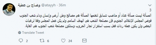 أوضح الإعلامي" وضاح بن عطية" عضو الجمعية الوطنية الجنوبية، فى سلسلة تغريدات على حسابه الشخصي على موقع التغريدات القصيرة، أن من ينتقدون المجلس الإنتقالي على قرار التهدئة، لا يأبهون بحياة الناس وهدفهم التحريض والتلاعب بعواطف العامة.