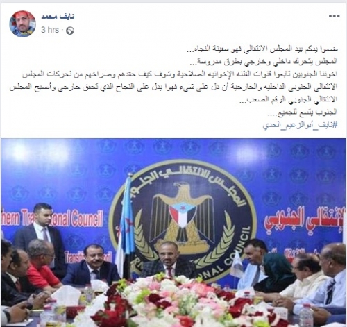 وشدد "اليافعي"، فى منشور له على موقع التواصل الإجتماعي "فيسبوك"، رصدها "المشهد العربي"، علي ضرورة تمسك الجنوبيين بالمجلس الإنتقالي لأنه سفينة النجاه، قائلا: " قنوات الفتنه الإخوانيه الصلاحية وشوف كيف حقدهم وصراخهم من تحركات المجلس الانتقالي الجنوبي الداخليه والخارجية أن دل على شيء فهوا يدل على النجاح".