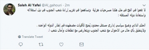 اليافعي: لا تساهموا في تقزيم إرادة شعب الجنوب لنيل استقلاله