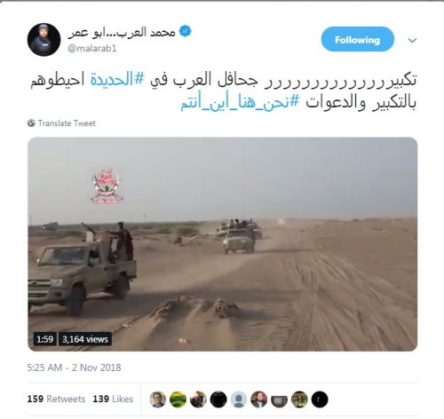 جاء ذلك في تغريدة له علي موقع التغريدات القصيرة، رصدها "المشهد العربي"، ودعا "العرب" للدعاء والتكبير، قائلا:تكبيرررررررررررررر جحافل العرب في #الحديدة احيطوهم بالتكبير والدعوات #نحنهناأين_أنتم".