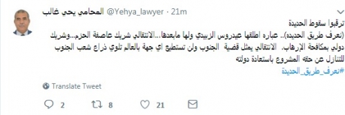 أكد القيادي الجنوبي ، المحامي "يحي غالب"، أن المجلس الانتقالي شريك أساسي مع عاصفة الحزم في معركة مكافحة الإرهاب، مشيرًا في تغريدة له علي موقع التغريدات القصيرة "تويتر"، رصدها "المشهد العربي"، إلي أن عبارة "نعرف طريق الحديدة"، التي أطلقها الرئيس القائد "عيدروس الزبيدي" بداية تحرير المدينة، قائلًا: "عباره اطلقها عيدروس الزبيدي ولها مابعدها،..الانتقالي شريك عاصفة الحزم...وشريك دولي بمكافحة الإرهاب".