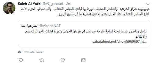وأوضح "اليافعي"، في تغريدة له علي موقع التغريدات القصيرة "تويتر"، رصدها "المشهد العربي"، أن مثل هذة الأخبار تدل علي قرب نهاية الشرعية، قائلا: "شوفو الشرعيه والتناقض المتخبط. ..تورط بها قيادي بالمجلس الانتقالي. والي ضبطها الحزام الامني التابع للمجلس الانتقالي...عاد الجنان يشتي له عقل.هستريه ما قبل طلوع الروح".