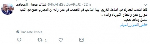 وأوضح "الجحافي"، في تغريدة له بموقع التغريدات القصيرة "تويتر"، رصدها "المشهد العربي"، قائلا: " كلما اشتدت المعارك في الساحل الغربي يبدأ التلاعب في الخدمات في عدن والله إن المجاري تطفح في اغلب شوارع عدن وانقطاع الكهرباء والماء ..تناسق وتناغم عجيب".