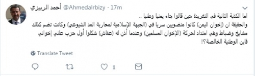 وأشار "الربيزي"، في تغريدة له علي موقع التغريدات القصيرة "تويتر"، رصدها "المشهد العربي"، إلي أن الجبهة الإسلامية كانت تضم مشايخ وضباط مقربين لـ"صالح"، قائلا: " والحقيقة ان (إخوان اليمن) كانوا منضويين سريا في (الجبهة الإسلامية لمحاربة المد الشيوعي) وكانت تضم كذلك مشايخ وضباط وهي امتداد لحركة (الإخوان المسلمين) وعندما أذن له (عفاش) شكلوا أول حزب علني إخواني فاين الوطنية الخالصة؟!".