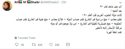 وأكد "الشيبي" في رسالته، علي أن الأوضاع قبل الوحدة، كانت أفضل بكثير مما يحدث الأن، قائلا: "كانت دولة الجنوب العربي قبل العام ٩٠ تعليم مجاني + منح دراسية في الخارج على حساب الدوله + علاج مجاني + منح طبية في الخارج على حساب الحكومه + منح عسكرية تأهيلية في الخارج + امن ولا موجود في اَي دولة