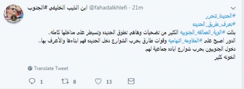 وحذر "الخليفي"، من دخول آلوية العمالقه مع قوات طارق في حرب شوارع، وذلك بسبب كثرة الخونه، مشيرًا في تغريدة له علي مواقع التغريدات القصيرة "تويتر"، رصدها "المشهد العربي"، قائلًا:" بذلت #الويةالعمالقهالجنوبيه الكثير من تضحيات وهاهي تطوق الحديده وتسيطر على مداخلها كامله..الدور اصبح على المقاومة التهامية وقوات طارق بحرب الشوارع دخل الحديده فهم ابناءها والأعرف بها..