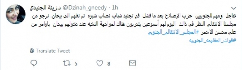 وقالت "زينة" فية تغريدتها، "عاجل ومهم للجنوبيين حزب الإصلاح بعد ما فشل في تجنيد شباب نصاب شبوه تم نقلهم الى بيحان. نرجو من مجلسنا الانتقالي النظر في ذالك اليوم لهم أسبوعين يتدربون هناك لمواجهة النخبه عند دخولهم بيحان باوامر من علي محسن الاحمر".
