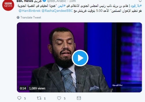 وصرح "بن بريك"، مؤكدًا أن العدو الحقيقي للقضية الجنوبية، هو تنظيم الإخوان المسلمين، ومن المنتظر أن تعرض قناة "بي بي سي"، لقائها مع "بن بريك" غدًا الأحد.