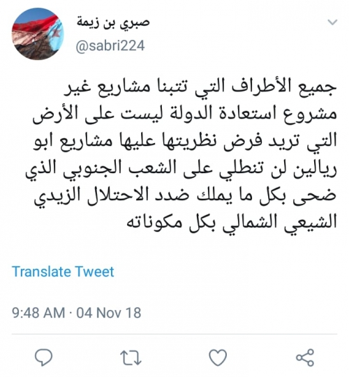 أكد الناشط السياسي "صبري بن زيمة"، في تغريدة له علي موقع التغريدات القصيرة "تويتر"، رصدها "المشهد العربي"، أن الأطراف والقوي التي تلهس وراء مشاريع غير مشروع استعادة الدولة ومؤسساتها، لن تجني شيئاً من تلاعبهم بالقضية، مؤكد قائلا: "جميع الأطراف التي تتبنا مشاريع غير مشروع استعادة الدولة ليست على الأرض التي تريد فرض نظريتها عليها مشاريع ابو ريالين لن تنطلي على الشعب الجنوبي".