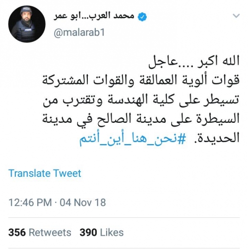 أعلن مراسل قناة سكاي نيوز العربية "محمد العرب"، فى تغريدة له على موقع التغريدات القصيرة "تويتر"، رصدها " المشهد العربي"، عن سيطرة ألوية العمالقة على مناطق ومحاور جديدة، قائلا: "قوات ألوية العمالقة والقوات المشتركة تسيطر على كلية الهندسة وتقترب من السيطرة على مدينة الصالح في مدينة الحديدة".