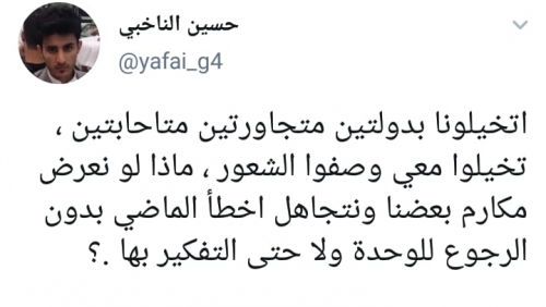 وأضاف فى تغريدة له على موقع التغريدات القصيرة "تويتر"، رصدها "المشهد العربي"، : "اتخيلونا بدولتين متجاورتين متاحابتين ، تخيلوا معي وصفوا الشعور ، ماذا لو نعرض مكارم بعضنا ونتجاهل اخطأ الماضي بدون الرجوع للوحدة ولا حتى التفكير بها ؟ ".