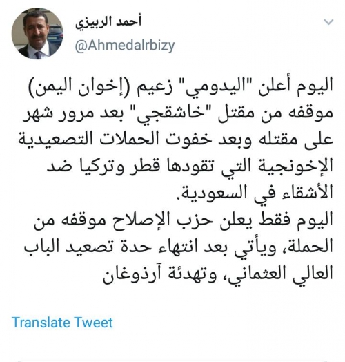 الربيزي: اليدومى أعلن موقفه من قضية خاشقجي بعد فشل حملات الإخوان التصعيدية