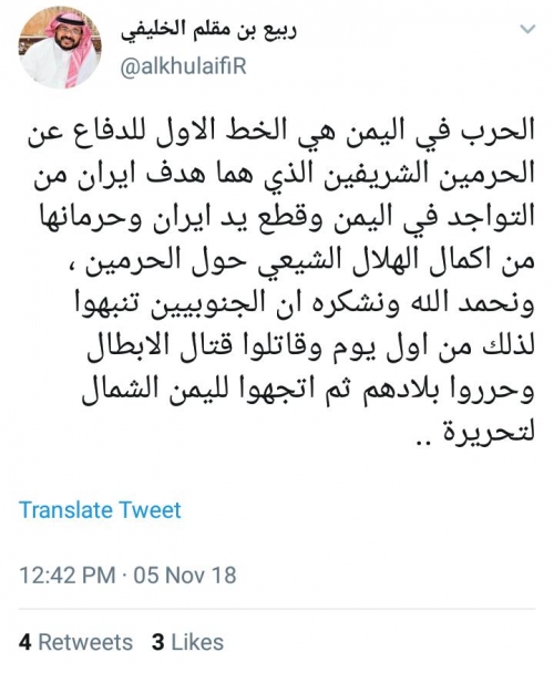 وأضاف فى تغريدة له على موقع التغريدات القصيرة تويتر، رصدها المشهد العربي، قائلا: "الحرب في اليمن هي الخط الاول للدفاع عن الحرمين الشريفين الذي هما هدف ايران من التواجد في اليمن وقطع يد ايران وحرمانها من اكمال الهلال الشيعي حول الحرمين ، ونحمد الله ونشكره ان الجنوبيين تنبهوا لذلك من اول يوم وقاتلوا قتال الابطال وحرروا بلادهم ثم اتجهوا لليمن الشمال لتحريره ".
