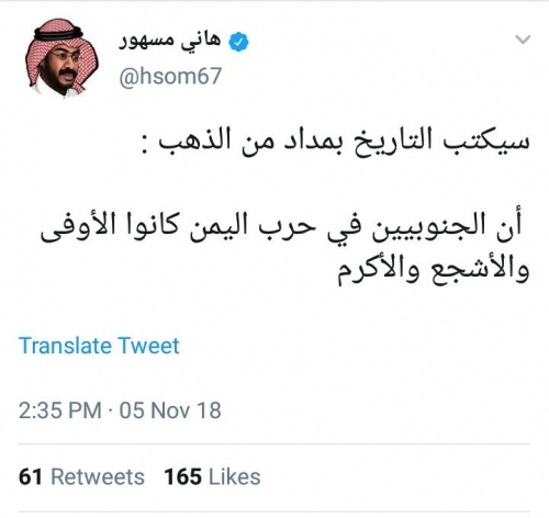 غرد الكاتب السياسي " هاني مسهور"، مشيدا وموثقا لنضال شعب الجنوب العربي، وقال عبر تغريده له على موقع التغريدات القصيرة "تويتر"، "سيكتب التاريخ بمداد من الذهب :.. أن الجنوبيين في حرب اليمن كانوا الأوفى والأشجع والأكرم".