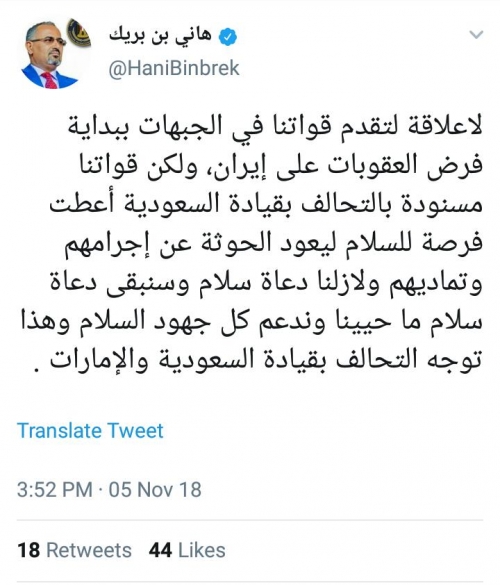 أكد النائب "هاني بن بريك"، فى تغريدة له عبر موقع التغريدات القصيرة "تويتر"، تابعها المشهد العربي، انه ليس علاقة بين تقدم قوات المقاومة الجنوبية وفرض عقوبات على إيران، قائلا: "لاعلاقة لتقدم قواتنا في الجبهات ببداية فرض العقوبات على إيران، ولكن قواتنا مسنودة بالتحالف بقيادة السعودية أعطت فرصة للسلام ليعود الحوثة عن إجرامهم وتماديهم ولازلنا دعاة سلام وسنبقى دعاة سلام ما حيينا وندعم كل جهود السلام وهذا توجه التحالف بقيادة السعودية والإمارات" .