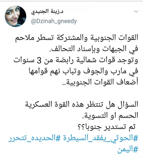 تعجبت الناشطة السياسية الدكتورة " زينة الجندي"، من تربص القوات الشمالية منذ ثلاثة سنوات، وذلك وسط تقدم مذهل للمقاومة الجنوبية، قائلة عبر تغريدة لها على موقع التغريدات القصيرة " تويتر"، رصدها " المشهد العربي"، "القوات الجنوبية والمشتركة تسطران ملاحم في الجبهات وبإسناد التحالف".