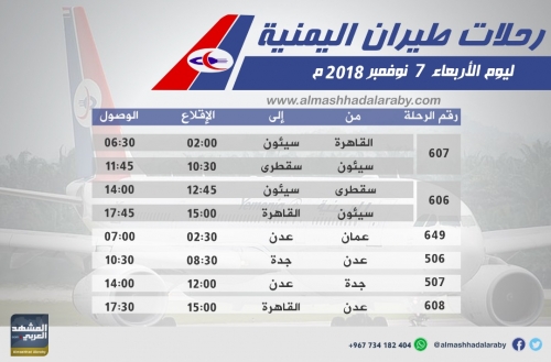 المشهد العربي ينشر مواعيد رحلات طيران اليمنية ليوم غد الأربعاء 7 نوفمبر 2018م.. انفوجرافيك