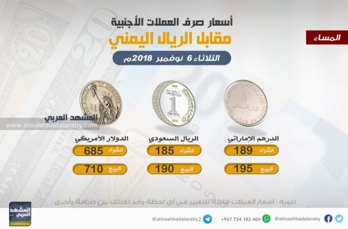 تعرف على أسعار صرف العملات الأجنبية مقابل الريال اليمني مساء اليوم الثلاثاء.. انفوجرافيك