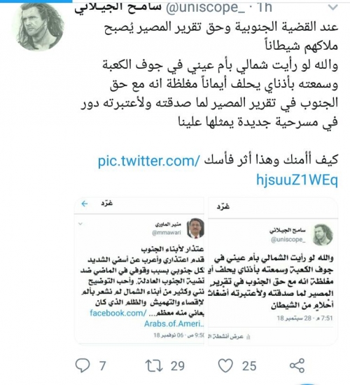 وقال "سامح الجيلاني" - "عند القضية الجنوبية وحق تقرير المصير يُصبح ملاكهم شيطاناً