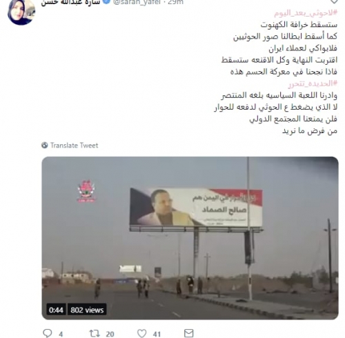 وقالت "سارة"، "ستسقط خرافة الكهنوت..كما أسقط ابطالنا صور الحوثيين.. فلابواكي لعملاء إيران.. اقتربت النهاية وكل الاقنعة ستسقط..فاذا نجحنا في معركة الحسم هذه..#الحديدة_تتحررِ..وادرنا اللعبة السياسيه بلغه المنتصر..لا الذي يضغط ع الحوثي لدفعه للحوار..فلن يمنعنا المجتمع الدولي..من فرض ما نريد".