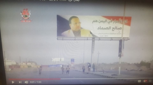 ونشر المركز الإعلامي لألوية العمالقة، فيديو يظهر عدد من المقاتلين يمزقون صور صالح الصماد الذي قتل في غارة جوية لطيران التحالف العربي في الحديدة بداية العام الحالي .
