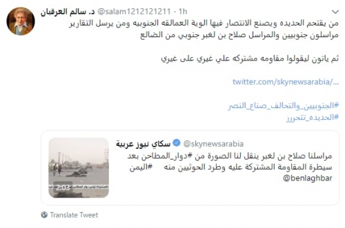 أكد الناشط السياسي الدكتور "سالم العرقبان"، فى تغريدة له على موقع التغريدات القصيرة "تويتر"، رصدها "المشهد العربي"، أن من يصنع الانتصار الأن فى الحديدة هم ألوية العمالقه الجنوبية.