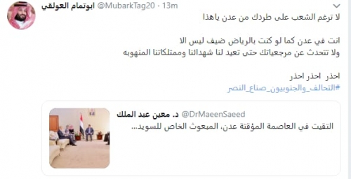 هاجم الناشط السياسي الجنوبي "ابو تمام العولقي"، عبر تغريدة له على "تويتر"، رصدها "المشهد العربي"، رئيس الوزراء اليمني "معين عبد الملك"، بعد لقائه بالمبعوث الخاص للسويد إلى اليمن.