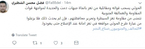 الشطيري: الحوثي ترك مواقع سيطرته فى تعز للإصلاح