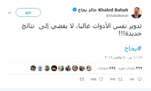 وقال خالد في تغريدة على صفحته بموقع التواصل الاجتماعي "تويتر" "تدوير نفس الأدوات غالبا، لا يفضي إلى نتائج جديدة!!".