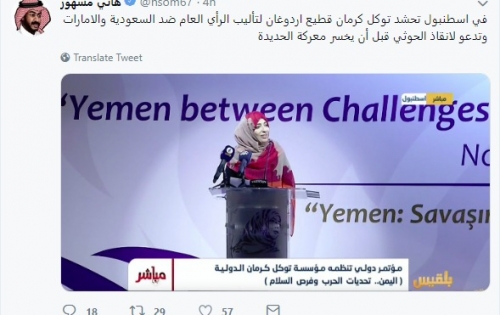 وقال مسهور، "في اسطنبول تحشد توكل كرمان قطيع أردوغان لتأليب الرأي العام ضد السعودية والإمارات وتدعو لإنقاذ الحوثي قبل أن يخسر معركة الحديدة".