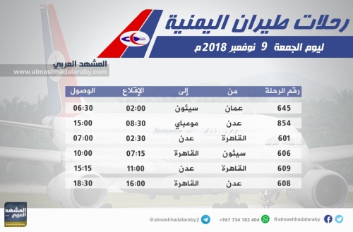 تعرف على مواعيد رحلات الطيران اليمنية اليوم الجمعة 9 نوفمبر 2018.