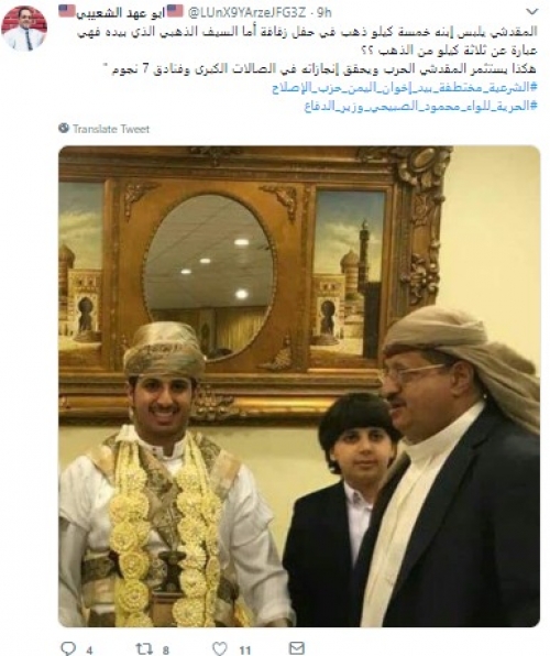 وأضاف، " المقدشي يلبس إبنه خمسة كيلو ذهب في حفل زفافة أما السيف الذهبي الذي بيده فهي عبارة عن ثلاثة كيلو من الذهب ؟؟ ..هكذا يستثمر المقدشي الحرب ويحقق إنجازاته في الصالات الكبرى وفنادق 7 نجوم " الشرعية مختطفة بيد إخوان اليمن حزب الإصلاح".