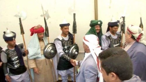 وتظهر الصورة رئيس مجلس النواب اليمني يحيى الراعي وهو يقوم بالسلام والتحية على عدد من الأشخاص يرتدون ملابس محاربين من عصر الرسالة.