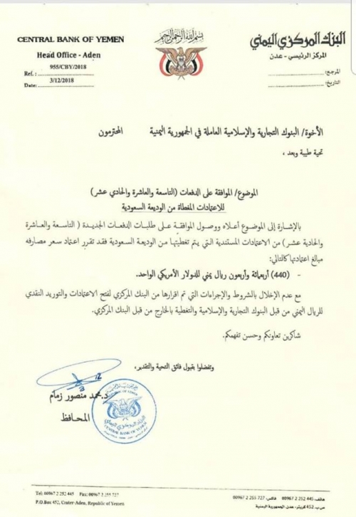 وجاء في التعميم الذي حصل "المشهد العربي" على نسخة منه، مخاطبة البنك المركزي للبنوك التجارية والإسلامية بتغطية الإعتمادات المستندية من الوديعة السعودية في دفعاتها التاسعة والعاشرة والحادية عشر، وفقاً لسعر صرف جديد للدولار والمقدر بـ 440 ريال يمني .