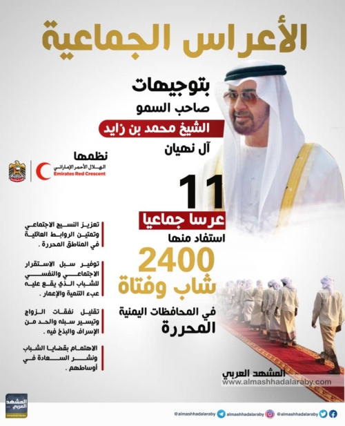 برعاية الهلال الإماراتي.. 11 عرساً جماعياً في المحافظات المحررة خلال عام زايد ( إنفوجراف )