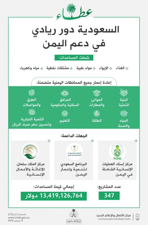 وأوضح الانفوجراف، الذي رصده "المشهد العربي"، أن السعودية لها دور ريادي في دعم اليمن، وشملت المساعدات عدة مجالات أهمها الغذاء، الإيواء، ومواد طبية، ومشتقات نفطية، ومياه وكهرباء.
