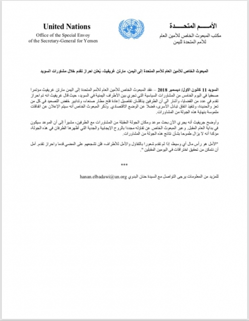 وعقد المبعوث الخاص للأمين العام للأمم المتحدة إلى اليمن مارتن غريفيث مؤتمرا صحفيا في اليوم الخامس من المشاورات التي تجري في السويد، حيث أعلن عن إحراز تقدم في عدد من القضايا.