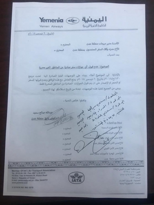 وأظهرت وثيقة صادرة بتاريخ 9 ديسمبر، أمر مدير منطقة إدارة عدن، بعدم قبول أي جوازات سفر صادرة من مناطق غير محررة.