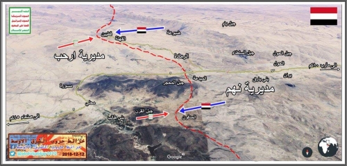 معركة نهم.. الموقف والسيطرة على الارض في جبهة نهم ليوم 12 - 12 - 2018 بعد سيطرة القوات الشرعية على قرية قطبين غرب جبل يام على الحدود بين مديريتي نهم وارحب".
