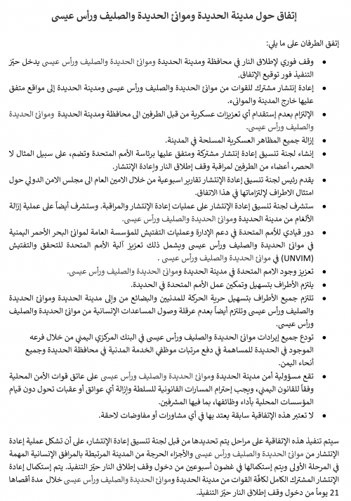 - وقف فوري لإطلاق النار في محافظة وميناء لحديدة والصليف ورأس عيسى يدخل حيز التنفيذ فور توقيع الاتفاق.