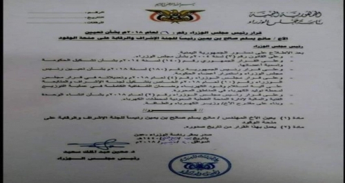 أصدر رئيس مجلس الوزراء، الدكتور معين عبدالملك، قرارا جاء في مادته الأولى، تكليف المهندس، مانع يسلم صالح بن يمين، رئيسا للجنة الإشراف والرقابة على منحة الوقود.