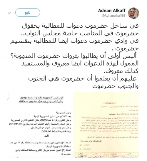 وأضاف في تغريده على حسابه الشخصي بموقع التواصل الاجتماعي «تويتر» رصدها «المشهد العربي»: في وادي حضرموت دعوات أيضا للمطالبة بتقسيم حضرموت .. أليس أولى أن يطالبوا بثروات حضرموت المنهوبة؟!