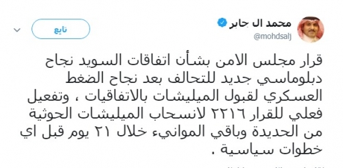 وقال في تغريده على حسابه الشخصي بموقع التواصل الاجتماعي «تويتر» رصدها «المشهد العربي»: قرار مجلس الأمن بشأن اتفاقات السويد نجاح دبلوماسي جديد للتحالف بعد نجاح الضغط العسكري لقبول المليشيات بالاتفاقيات، وتفعيل فعلي للقرار ٢٢١٦ لانسحاب المليشيات الحوثية من الحديدة وباقي الموانئ خلال ٢١ يوما قبل أي خطوات سياسية.