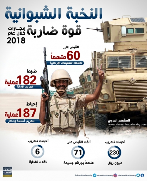 يرصد المشهد العربي أهم انجازات قوات النخبة الشبوانية خلال عام 2018 م ( انفوجرافيك ):