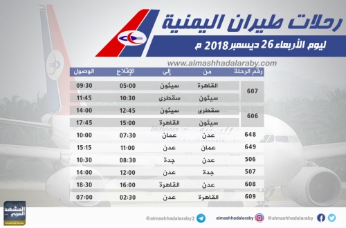 «المشهد العربي» ينشر جدول مواعيد رحلات طيران اليمنية غدًا الأربعاء 26 ديسمبر 2018 م :