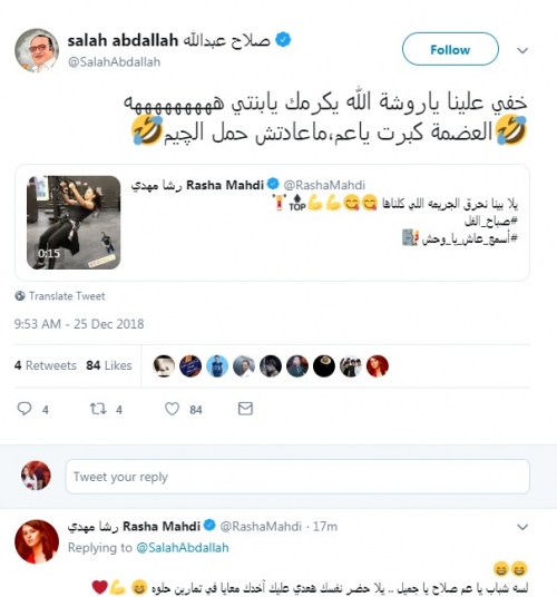 ليمازحها الفنان الكبير صلاح عبد الله، ويعلق "خفى علينا يا روشة الله يكرمك يا بنتى"، العضمة كبرت يا عم معدتش حمل الجيم"، لترد: "لسه شباب يا عم صلاح يا جميل.. يلا حضر نفسك هعدي عليك آخدك معايا في تمارين حلوة".